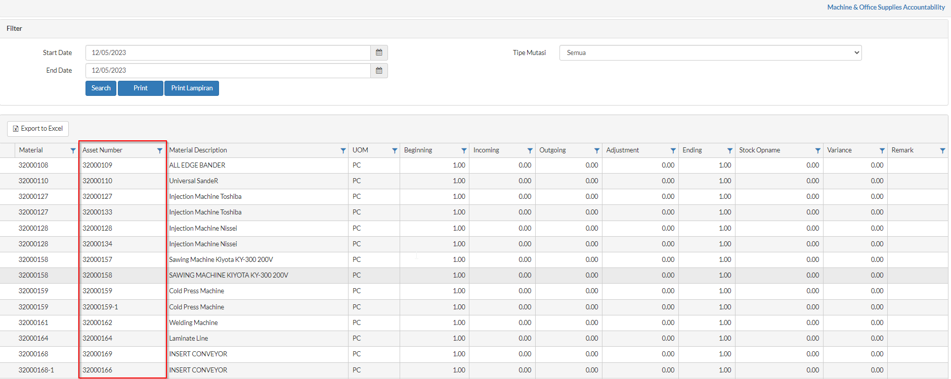 11. Penambahan Kolom Nomor Asset Pada Laporan Mutasi Mesin & Perlatan Kantor CDMS