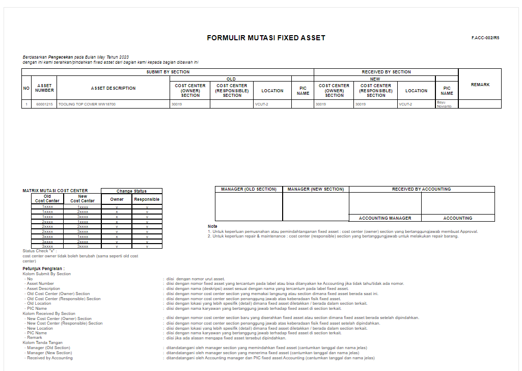 Berikut ini adalah tampilan dari dokumen Form Mutasi Asset, lalu User bisa klik print untuk mengeluarkan formatnya